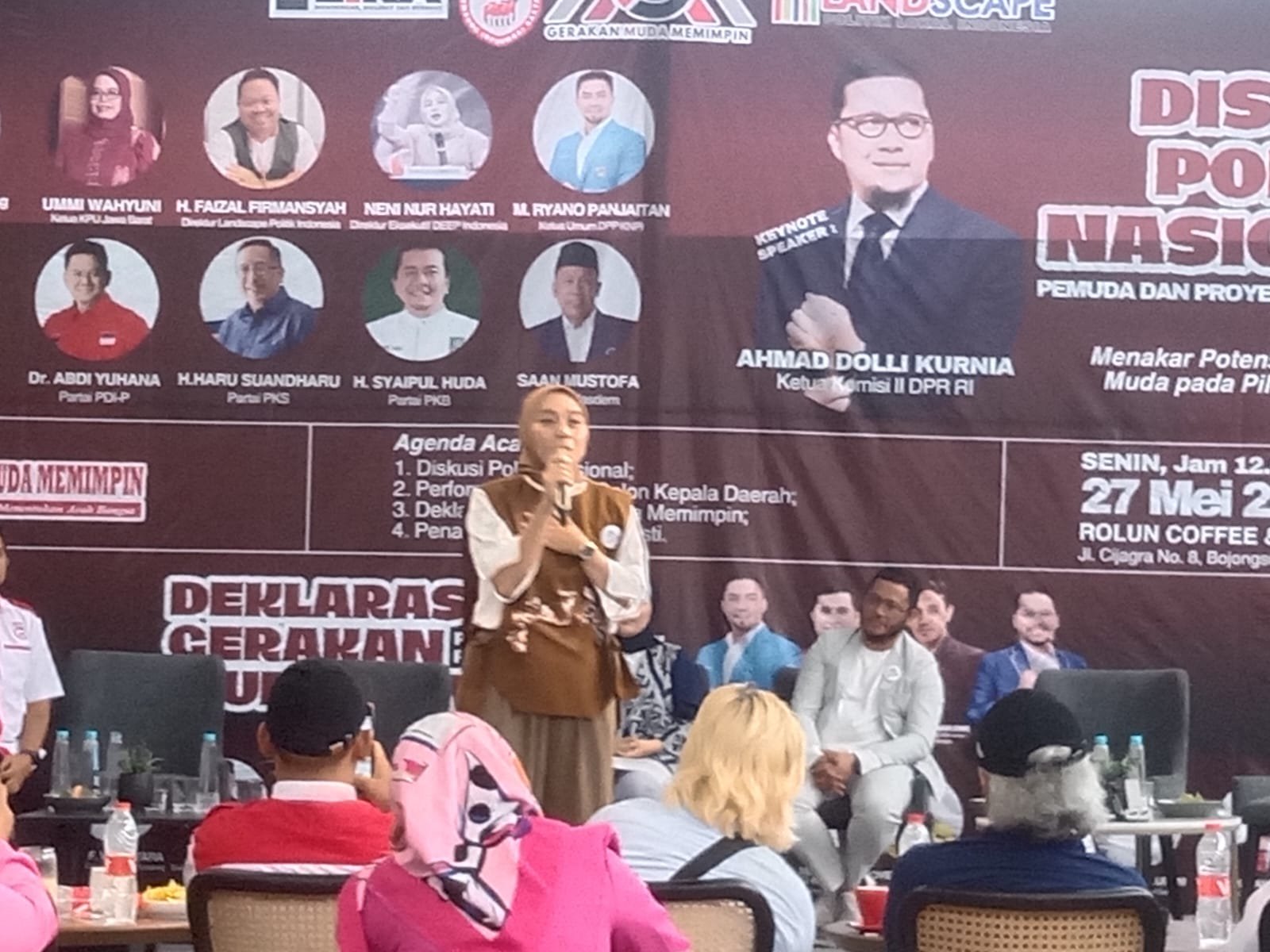 Kab.Bandung-Tokoh Pemudi yang juga Bakal Calon Bupati Garut Jawa Barat. dr g Putri Karlina, turut aktif hadiri menjadi pembicara dalam kegiatan Diskusi Politik Nasional Pemudi dan Proteksi Pilkada 2024 yang diselenggarakan gabungan LSM Lumbung Informasi Rakyat (LIRA), Gerakan Muda Memimpin (MGM) dan Landscape Politik Lokal Indonesia. Berlangsung di Rolun Coffee & Pastry. Jl.Cijagra No.8 Bojongsoang Kabupaten Bandung. Senin (27/05/2024)