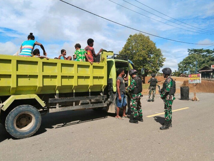 Boven Digoel ~ Anggota TNI dari Satgas Pamtas Statis RI-PNG Yonif 111/KB yang bertugas sektor Kolakops Korem 174/Anim Ti Waninggap melakukan pemeriksaan terhadap kendaraan yang keluar masuk Wilayah Perbatasan darat Papua Selatan, Minggu, (02/06/2024)