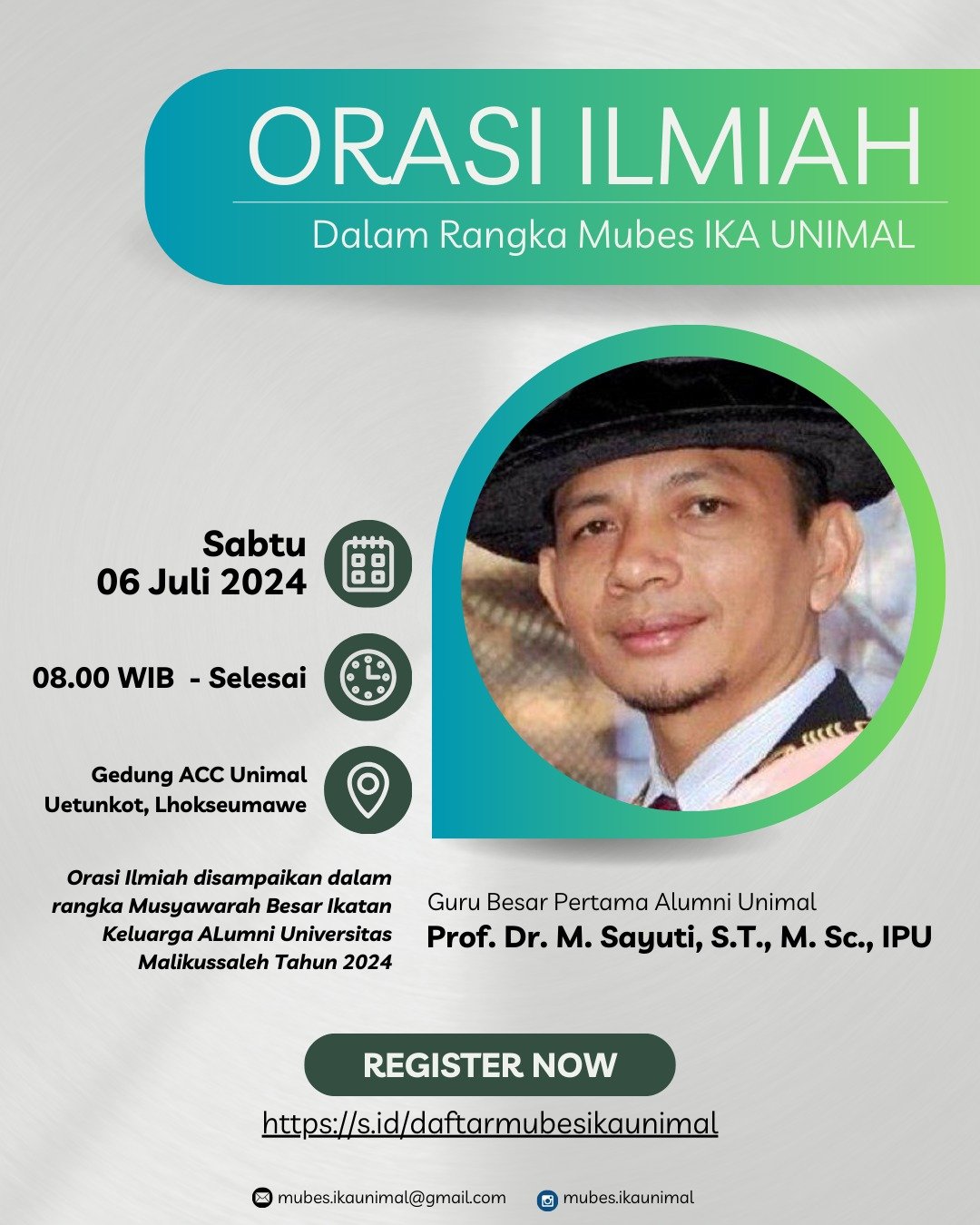 Dalam kegiatan mubes tersebut akan diisi dengan orasi ilmiah oleh Prof. M. Sayuti, beliau adalah alumni Fak Teknik Unimal dan juga prof pertama di unimal saat itu.