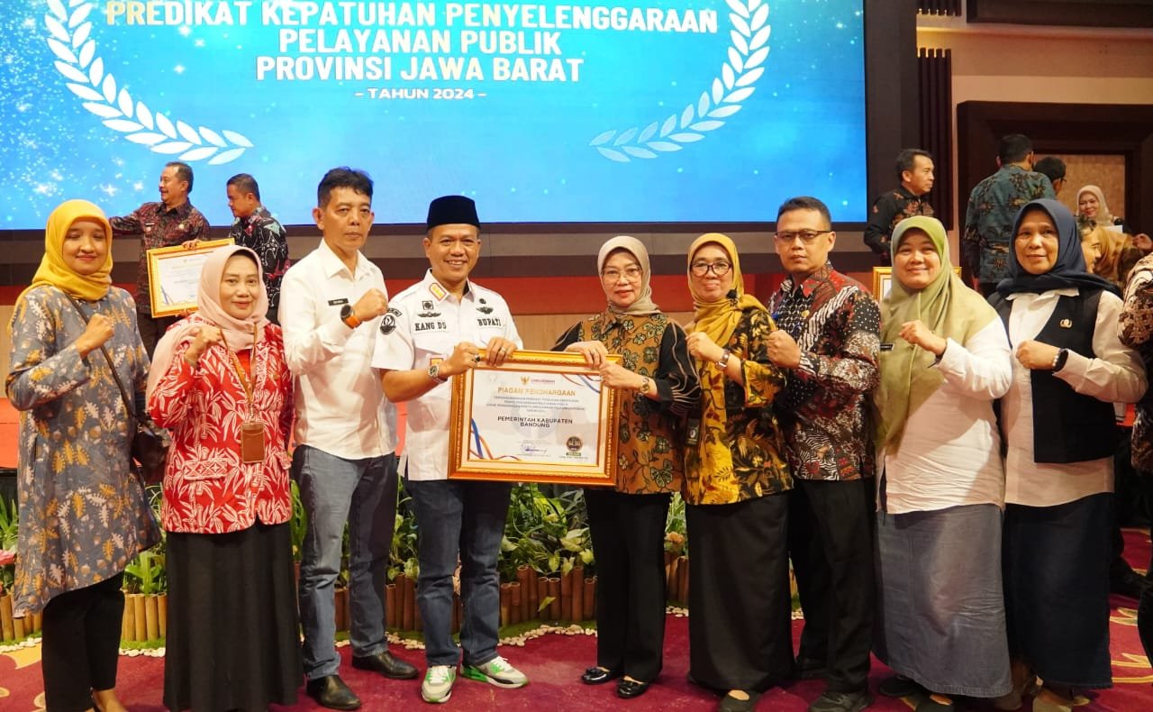 Penghargaan diterima Bupati Bandung pada ajang Penganugerahan Predikat Penilaian Kepatuhan Penyelenggaraan Pelayanan Publik Pemerintah Kab/Kota di Jabar tahun 2024 di Grand Sunshine Soreang, Rabu (04/12/2024).