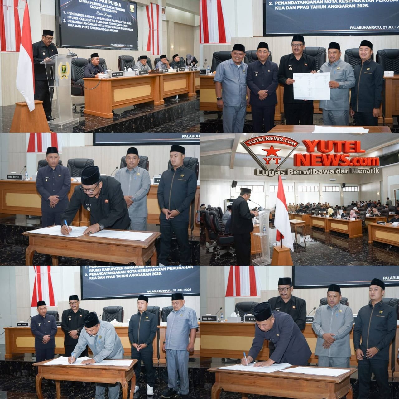 Sukabumi – Yutelnews.com ,Bupati Sukabumi H Asep Japar didampingi Wakil Bupati H Andreas menghadiri rapat Paripurna DPRD agenda pengambilan keputusan atas raperda tentang RPJMD Kabupaten Sukabumi tahun 2025-2029 dan penandatanganan nota kesepakatan perubahan Kebijakan Umum Anggaran (KUA) dan Prioritas Plafon Anggaran Sementara (PPAS) tahun anggaran 2025. Sidang berlangsung di ruang rapat paripurna DPRD Kabupaten Sukabumi, Senin (21/7/2025).