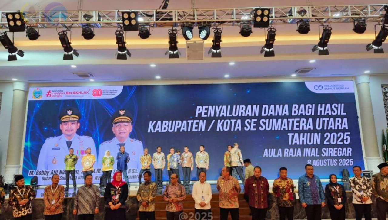 YUTELNEWS.com | Pemerintah Kota Gunungsitoli menerima Dana Bagi Hasil (DBH) Tahun Anggaran 2025 dari Pemerintah Provinsi Sumatera Utara dalam Acara Penyaluran DBH oleh Gubernur Sumatera Utara Kepada Bupati/Wali Kota se-Sumatera Utara bertempat di Aula Tengku Rizal Nurdin Kantor Gubernur Sumatera Utara Medan, Jumat 08/08/2025.