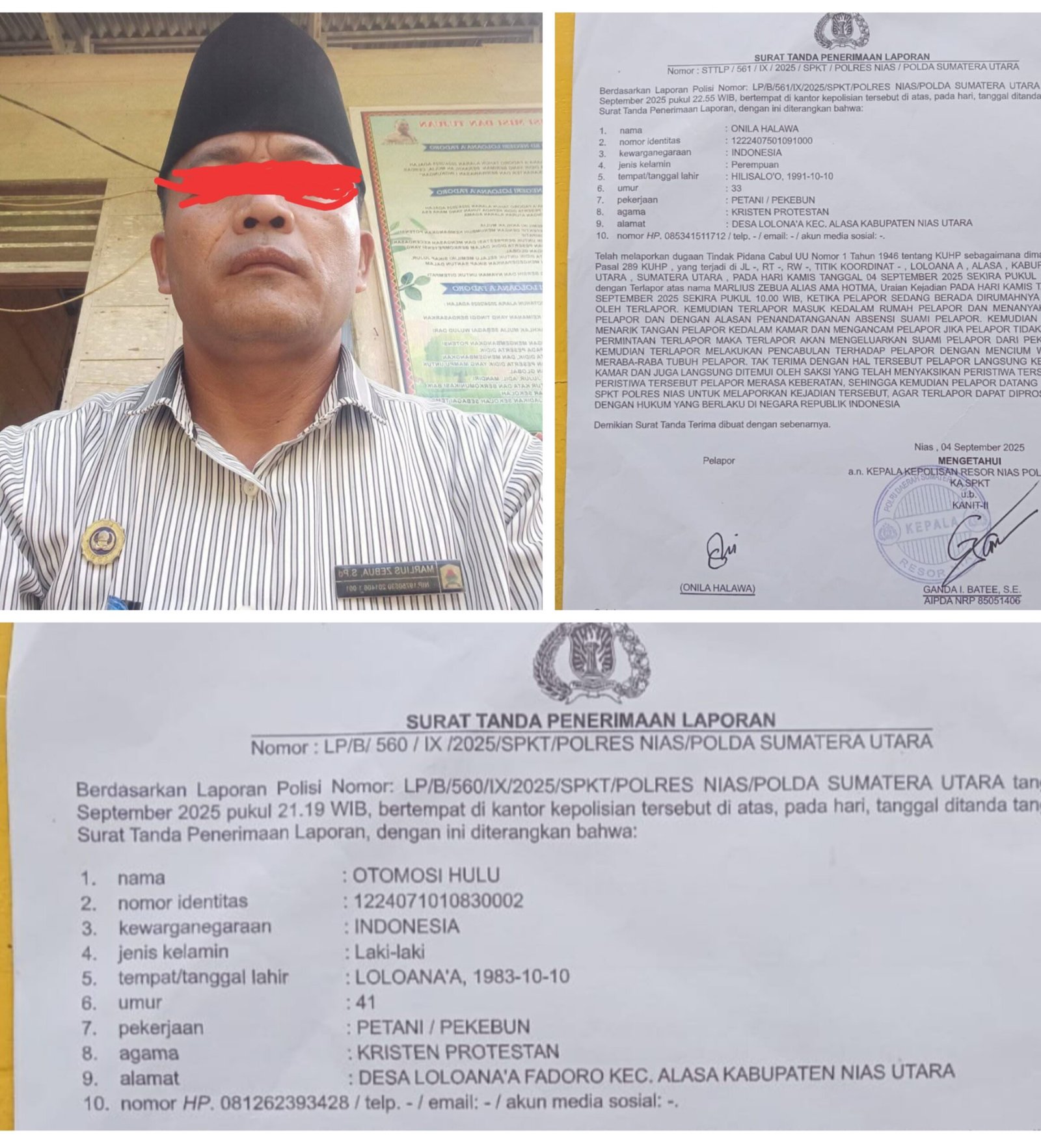 YUELNEWS.Com | Nias Utara Oknum Kepala Sekolah Dasar ( SD) Negeri Loloana’a Fadoro Kecamatan Alasa Kabupaten Nias Utara An. M, Zebua S.Pd SD Alias Ama Hotman Zebua Melakukan perbuatan mesum atau melakukan pelecehan seksual dengan seorang warga yang punya suami . Akhirnya korban Membuat Laporan di Polres Nias. Nomor : LP/B/561/IX/2025/SPKT/Polres Nias Sumatera Utara. Kamis 4/9/2025.