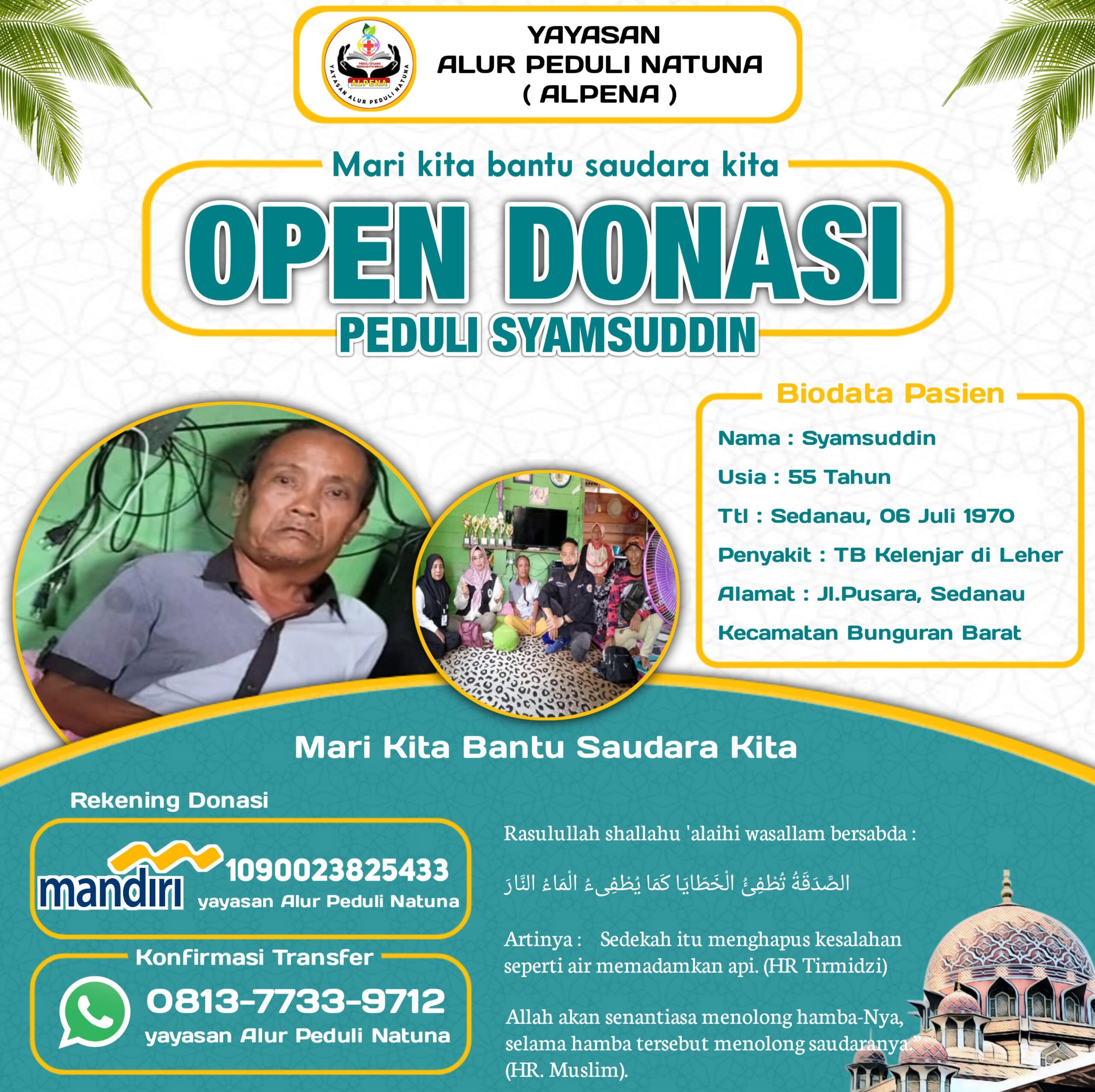 Melihat kondisi tersebut, ALPENA (Aliansi Peduli Natuna) yang diketuai oleh Rahayu Christinawati, bersama para relawan, menginisiasi gerakan open donasi guna membantu biaya pengobatan Syamsuddin.