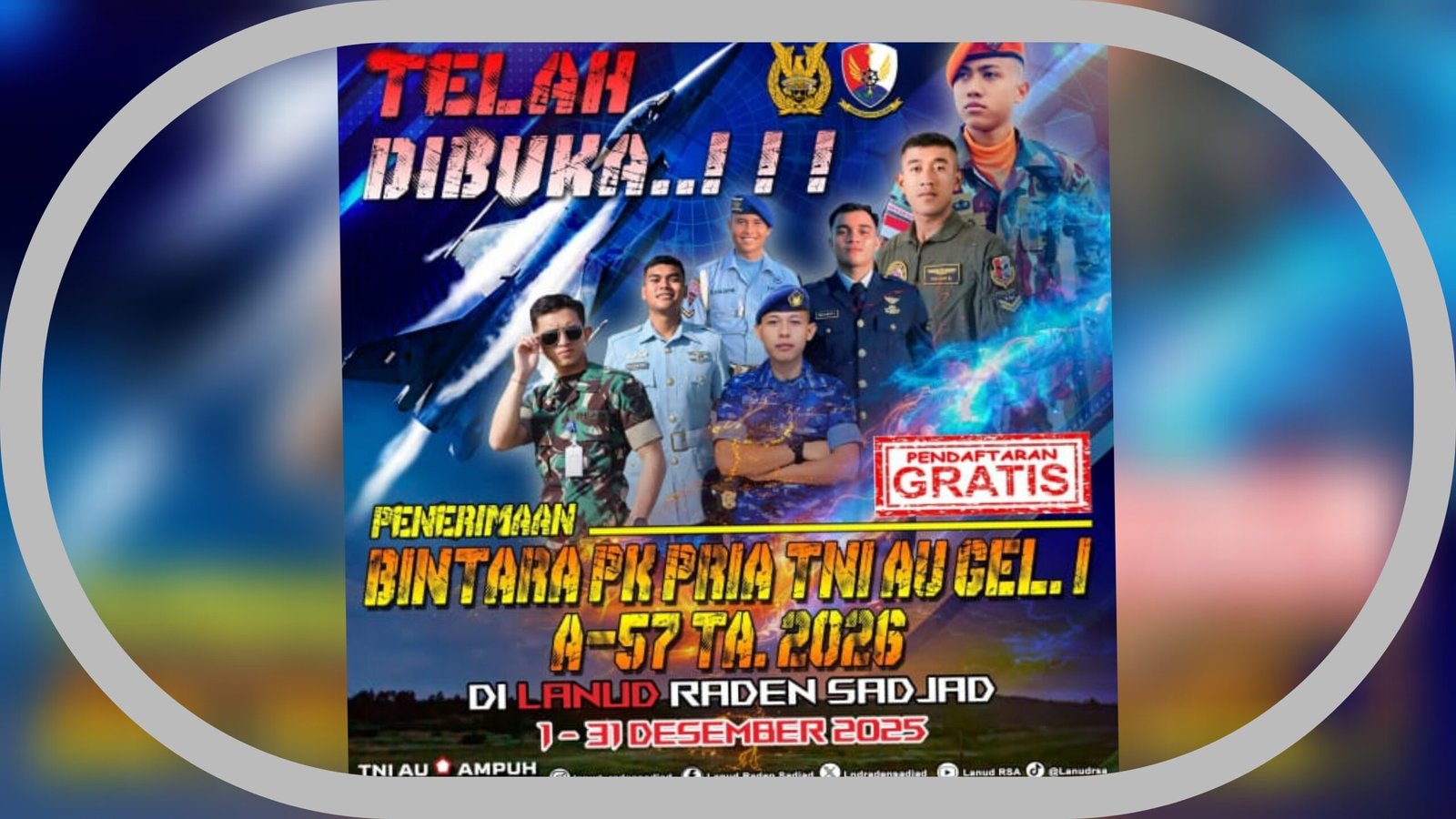 Natuna –YUTELNEWS.com Kesempatan emas kembali hadir bagi putra-putra terbaik Natuna yang bercita-cita mengabdi kepada bangsa. TNI Angkatan Udara melalui Lanud Raden Sadjad resmi membuka Penerimaan Bintara Prajurit Karier (PK) Pria TNI AU Gelombang I/A-57 Tahun 2026.