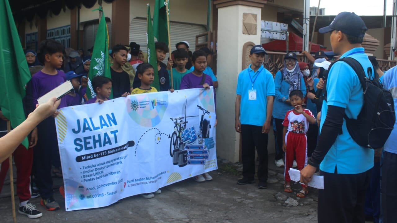 YUTELNEWS.com | Demak- Pimpinan Cabang Muhammadiyah (PCM) Mranggen, Demak, Jawa Tengah menggelar kegiatan Jalan Sehat dalam rangka memperingati Milad ke-113 Muhammadiyah, Ahad (30/11/2025). Kegiatan dipusatkan di Komplek Lembaga Kesejahteraan Sosial Anak (LKSA) Panti Putra Muhammadiyah, Jalan Batursari Raya, Batursari, Mranggen, Demak.