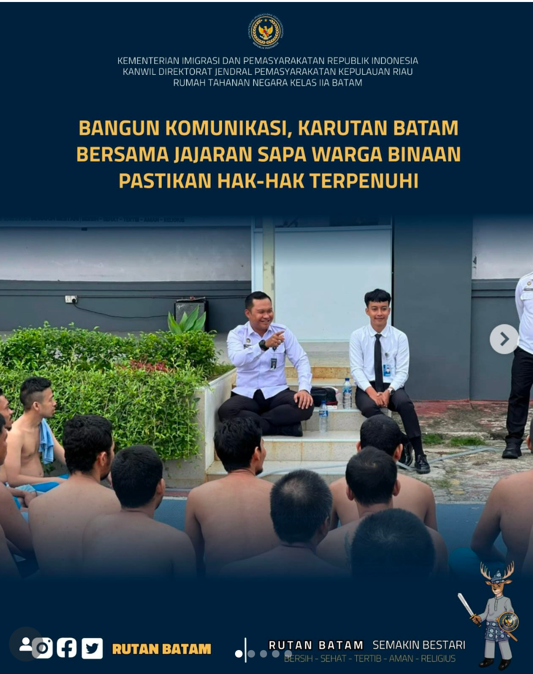 Rutan Batam berkomitmen untuk terus mengoptimalkan pemenuhan hak-hak dan pelayanan bagi warga binaan sebagai bagian dari upaya mewujudkan layanan pemasyarakatan yang lebih baik, humanis, serta memenuhi standar hak asasi manusia./Red
