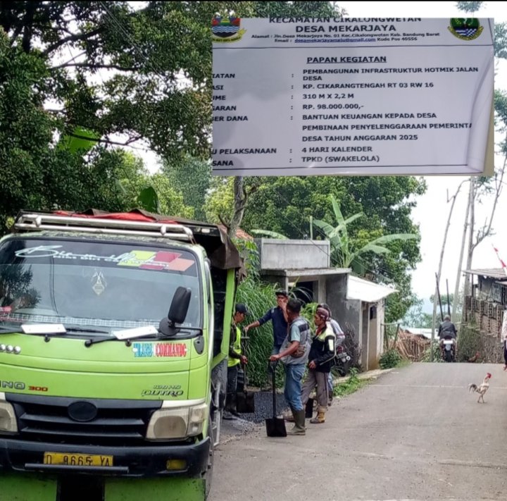YUTELNEWS.com | Kab. Bandung Barat – Pemerintah Desa Mekarjaya, Kecamatan Cikalongwetan, Kabupaten Bandung Barat (KBB) merealisasikan Bantuan Keuangan kepada Desa untuk Pembinaan Penyelenggaraan Pemerintahan Desa Tahun Anggaran 2025. Bantuan tersebut digunakan untuk pembangunan infrastruktur berupa pengaspalan (hotmix) jalan lingkungan di Kampung Cikarangtengah, RT 03 RW 16. Senin, (8/12/2025).
