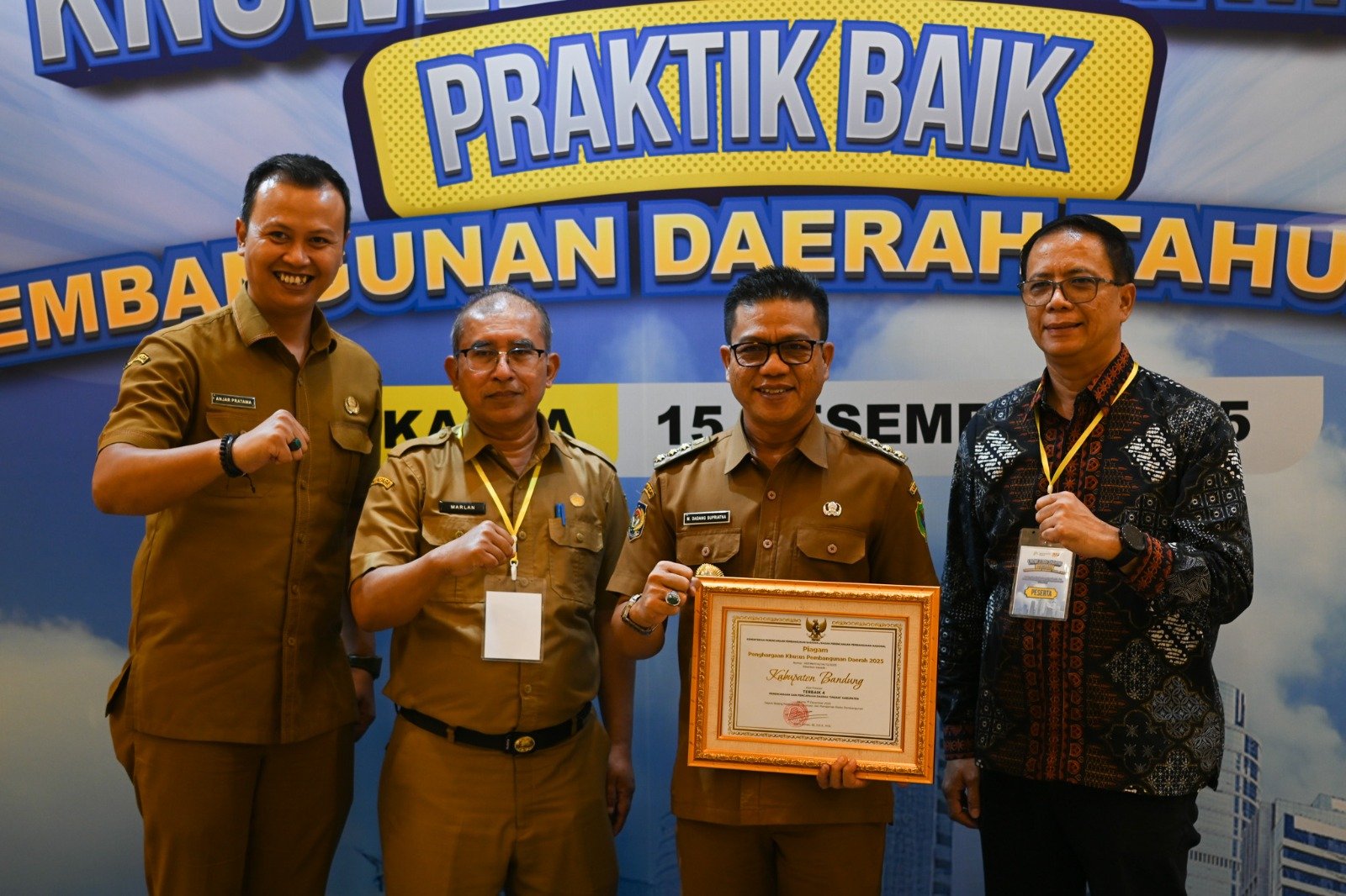 Penghargaan tersebut diberikan oleh Kementerian Perencanaan Pembangunan Nasional/Badan Perencanaan Pembangunan Nasional (Kementerian PPN/Bappenas) dan diterima langsung oleh Bupati Bandung, Dadang Supriatna didampingi Sekretaris Daerah Kabupaten Bandung, Cakra Amiyana, serta Kepala Badan Perencanaan Pembangunan dan Riset Daerah (Bapperida) Kabupaten Bandung, Marlan.