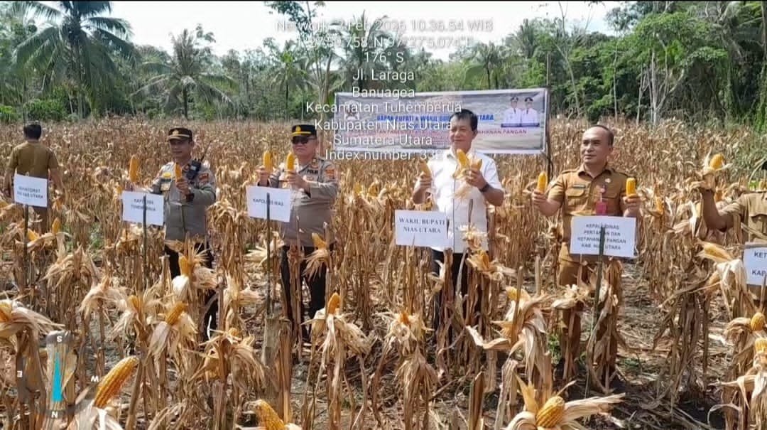 YUTELNEWS.com | Banuagea Nias utara – Panen raya jagung yang berlangsung di lahan seluas kurang lebih 2 hektar di Desa Banua Gea, Kecamatan Tuhemberua, Nias Utara, menjadi momen penting dalam upaya meningkatkan ketahanan pangan di daerah tersebut. Kegiatan yang dilaksanakan pada hari Selasa, 3 Februari 2026 ini dihadiri langsung oleh Wakil Bupati Nias Utara, Yusman Zega, serta perwakilan dari Kapolres Nias Kabag SDM, Kapolsek Tuhemberu,Sekcam Tuhemberua, kepala dinas pertanian Nias Utara, perangkat desa, tokoh masyarakat, dan Penyuluh Pertanian Lapangan (PPL) Kecamatan Tuhemberua.