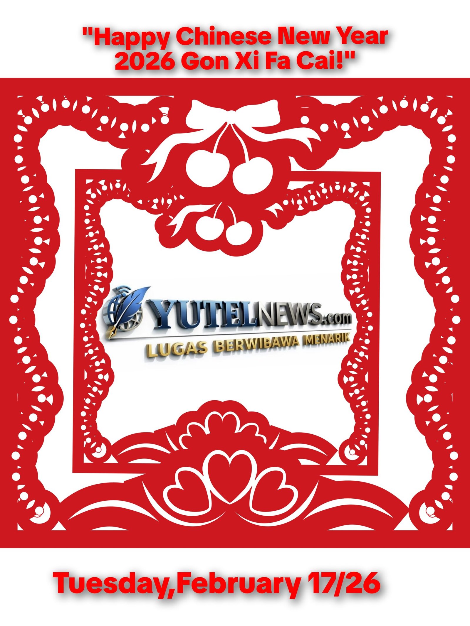 Pimpinan Perusahaan bersama Pimpinan Redaksi serta seluruh jajaran wartawan Yutelnews menyampaikan ucapan Selamat Tahun Baru Imlek 2577 Kongzili kepada seluruh masyarakat Tionghoa serta pembaca setia di seluruh Indonesia.