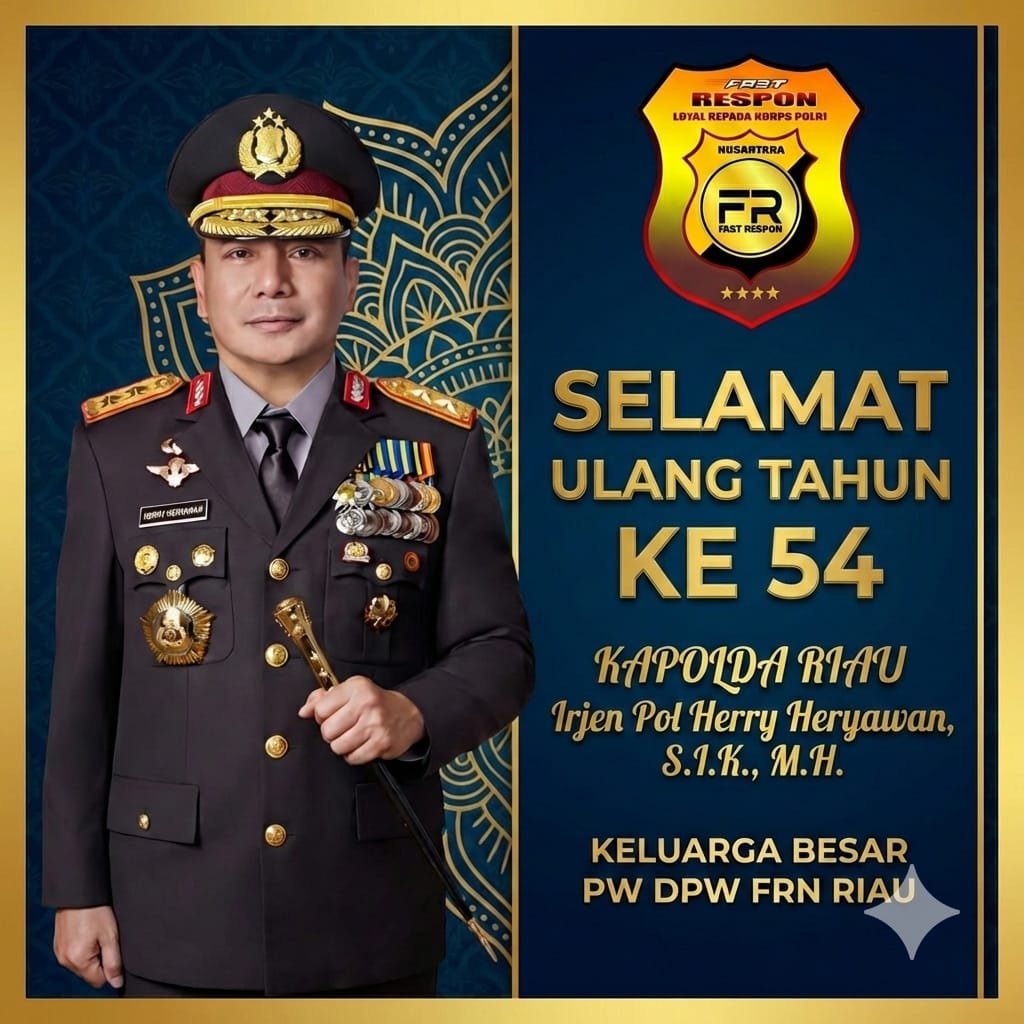 YUTELNEWS.com|Ketua Perkumpulan Wartawan Fast Respon Nusantara (PW-FRN), wilayah Riau Adam Silaen ,beserta seluruh jajaran pengurus wilayah Riau dan kabupaten menyampaikan ucapan selamat ulang tahun yang ke-54 untuk Kapolda Riau Irjen pol Herry Heryawan S.I.K M.H.
