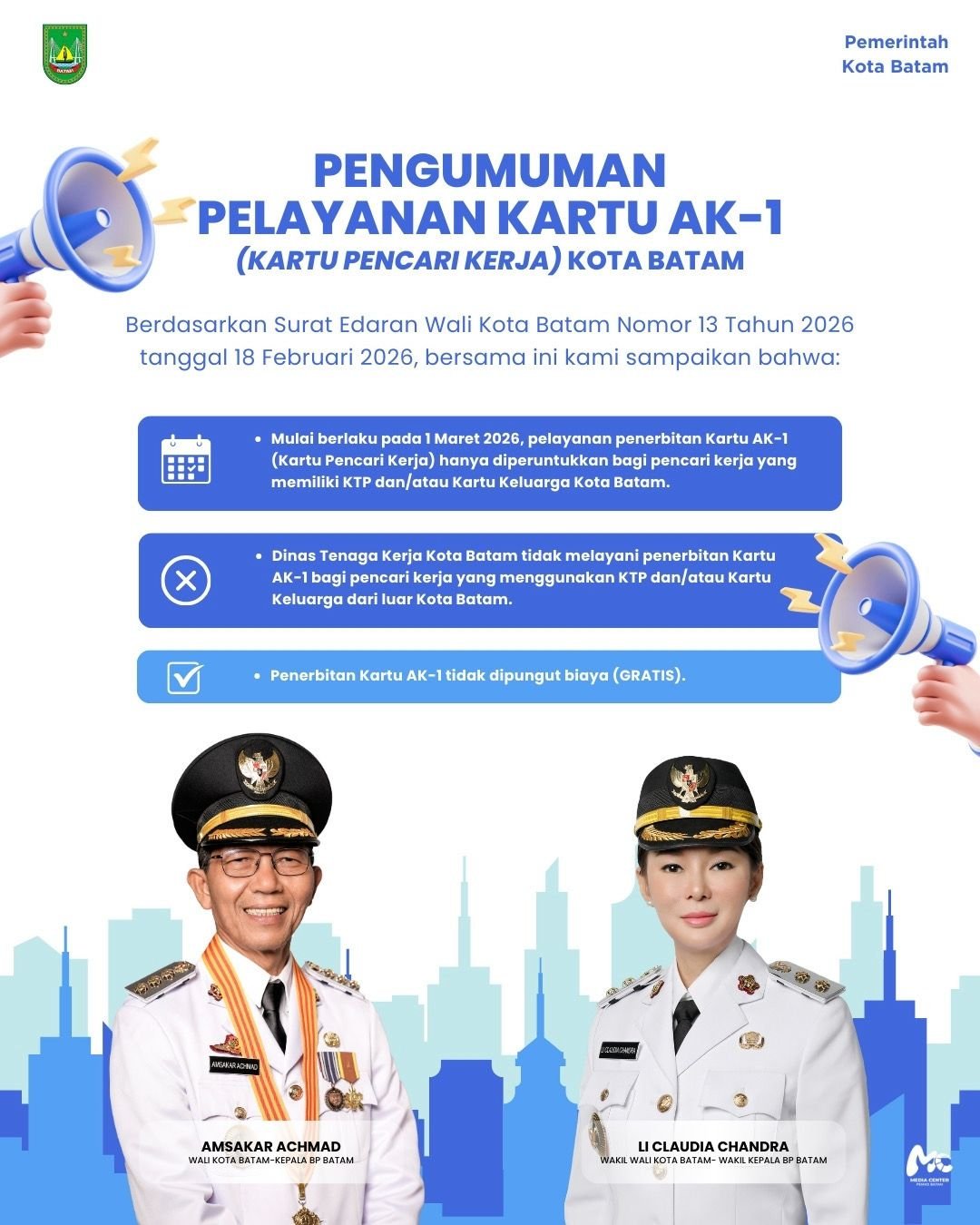 Yutelnews.com / Kebijakan baru terkait pelayanan kartu pencari kerja resmi diberlakukan Pemerintah Kota Batam. Wali Kota Batam, Amsakar Achmad, menerbitkan Surat Edaran (SE) Nomor 13 Tahun 2026 tentang Pelayanan Kartu Pencari Kerja (AK/1) atau Kartu Digital Angkatan Kerja (SIAPkerja-ID) yang efektif mulai 1 Maret 2026.