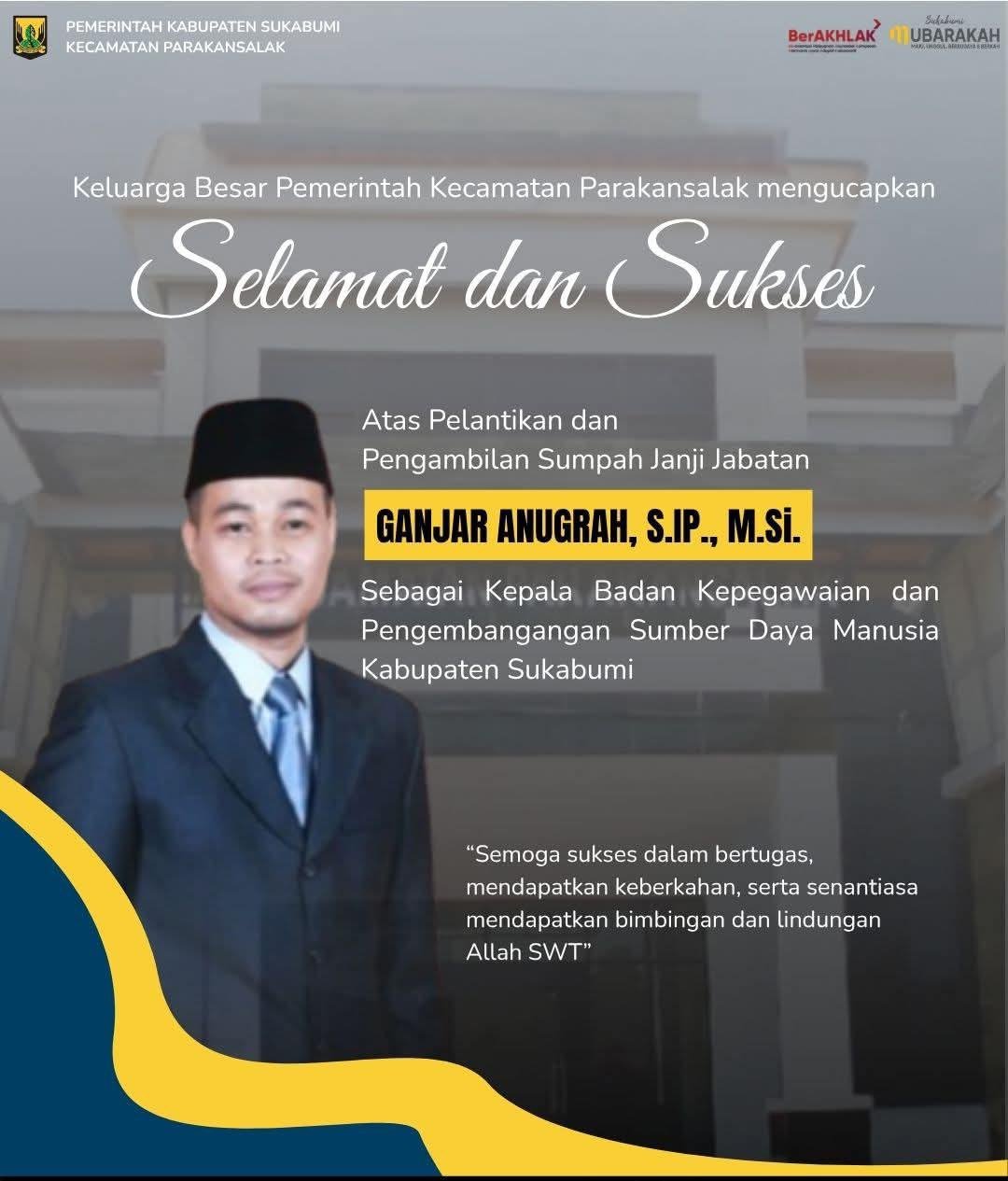 YUTELNEWS.com | SUKABUMI ,Birokrasi Kabupaten Sukabumi mendapat angin segar dengan dilantiknya Ganjar Anugrah, S.IP., M.Si. sebagai Kepala Badan Kepegawaian dan Pengembangan Sumber Daya Manusia (BKPSDM) Kabupaten Sukabumi. Pelantikan dan pengambilan sumpah/janji jabatan berlangsung khidmat, dihadiri oleh jajaran pejabat daerah, ASN, serta tamu undangan lainnya. Rabu ( 1/4/2026 )