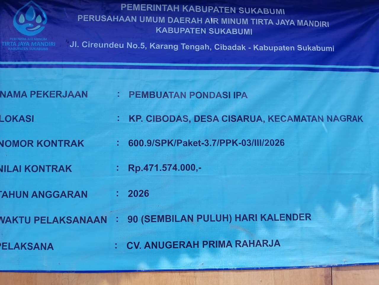 Pembangunan pondasi IPA ini dikerjakan oleh CV Anugerah Prima Raharja pada tahun anggaran 2026. Proyek ini diharapkan menjadi fondasi awal bagi sistem pengolahan air yang lebih optimal dan berkelanjutan di kawasan tersebut.